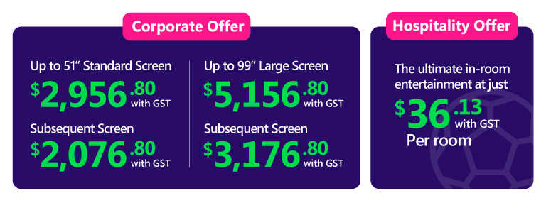 From guest rooms to big screens, bring all 104 matches to your customers in breathtaking 4K and create a high-energy experience they will not want to miss. Draw bigger crowds, extend dwell time and keep customers coming back throughout the game.
