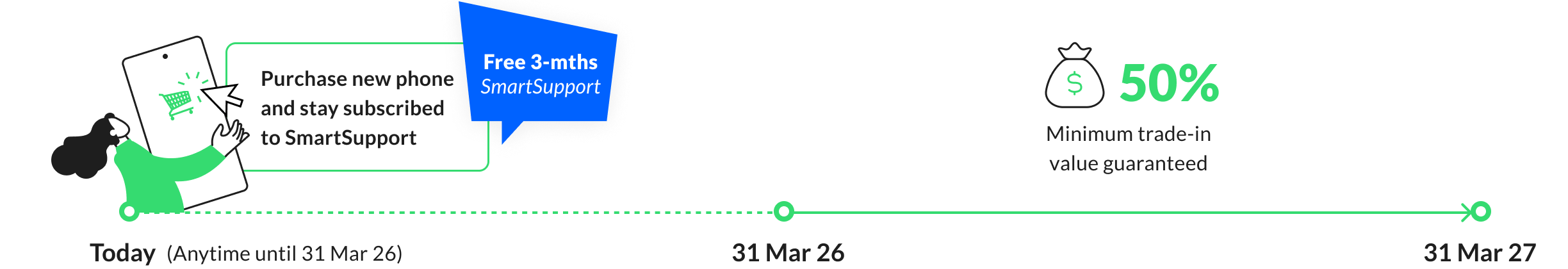 You can enjoy the minimum trade-in guarantee for your next Galaxy S Series upgrade only if you purchased the Samsung Galaxy S26 Series from StarHub and subscribed to SmartSupport from your date of purchase, on or before 31 March 2026.